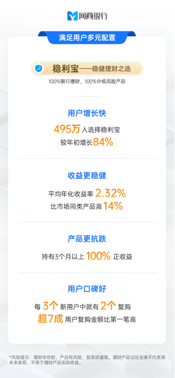 网商银行推出银行理财专卖平台稳利宝,因其产品均为100%中低风险的银行理财,收益更稳健,2025年平均年化收益率为2.32%,比市场同类产品高14%。在风险可控制层面,稳利宝用户实现持有3个月以上全部正收益。收益稳、波动小的表现让稳利宝备受用户青睐,2025年其用户数达到495万,较年初增长84%。