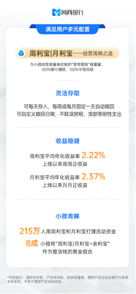 传统理财周期长、灵活性差,网商银行为小微定制了一套黄金组合:“周利宝/月利宝” + “余利宝”,无论是有计划的大笔支出,还是随时需要用到的小额资金,都让小微经营者理财有选择、操作更便捷、收益更稳健。