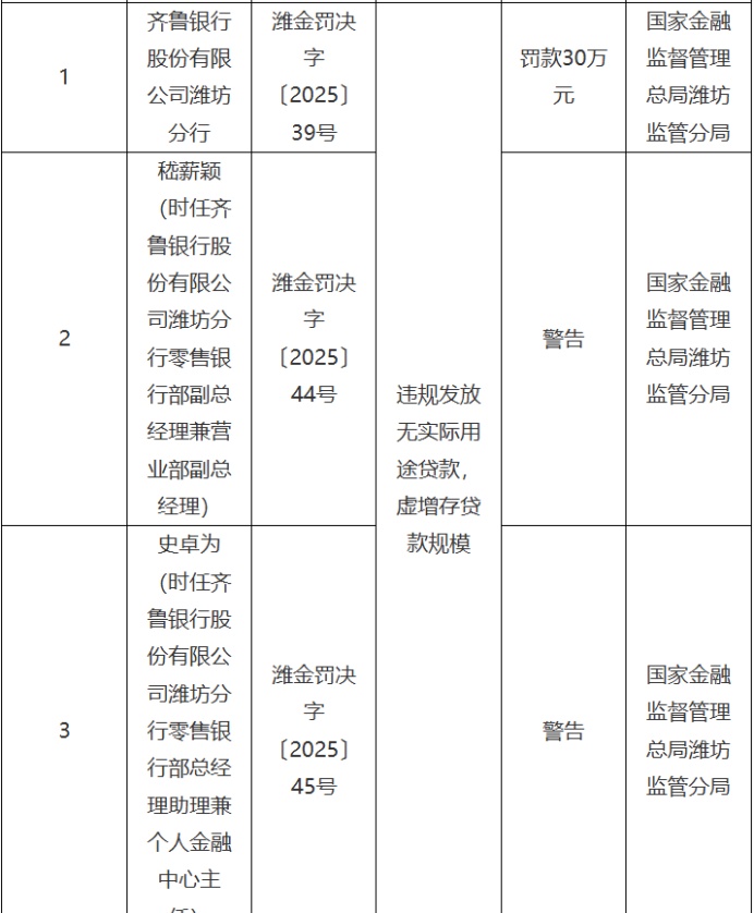 其中,齐鲁银行潍坊分行因违规发放无实际用途贷款、虚增存贷款规模被罚款30万元。同时,嵇薪颖(时任齐鲁银行股份有限公司潍坊分行零售银行部副总经理兼营业部副总经理)和史卓为(时任齐鲁银行股份有限公司潍坊分行零售银行部总经理助理兼个人金融中心主任)分别被警告。