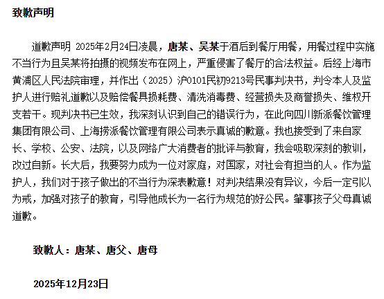 2025年2月24日凌晨,唐某、吴某于酒后到餐厅用餐,用餐过程中实施不当行为且吴某将拍摄的视频发布在网上,严重侵害了餐厅的合法权益。后经上海市黄浦区人民法院审理,并作出(2025)沪0101民初9213号民事判决书,判令本人及监护人进行赔礼道歉以及赔偿餐具损耗费、清洗消毒费、经营损失及商誉损失、维权开支若干。现判决书已生效,我深刻认识到自己的错误行为,在此向四川新派餐饮管理集团有限公司、上海捞派餐饮管理有限公司表示真诚的歉意。我也接受到了来自家长、学校、公安、法院,以及网络广大消费者的批评与教育,我会吸取深刻的教训,改过自新。长大后,我要努力成为一位对家庭,对国家,对社会有担当的人。作为监护人,我们对于孩子做出的不当行为深表歉意!对判决结果没有异议,今后一定引以为戒,加强对孩子的教育,引导他成长为一名行为规范的好公民。肇事孩子父母真诚道歉。