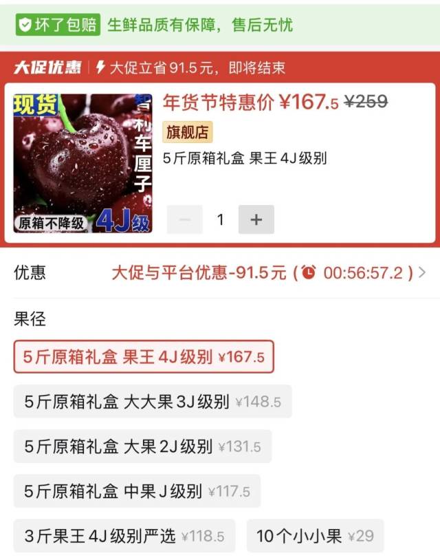 6日,中新经纬在某电商平台上看到,部分5斤原箱4J车厘子卖到了167.5元/箱,约合33.5元/斤;3J车厘子145元/箱,约合29元/斤。