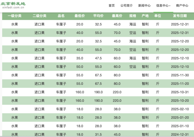 自2025年12月10日起,北京新发地官网开始分别披露空运车厘子和海运车厘子价格,其中空运车厘子批发均价变化不大,2025年12月10日、20日、31日的报价均为55元/公斤;海运车厘子的批发均价则从2025年12月10日的47.5元/斤,降至2025年12月20日的32.5元/斤,10天降了31.6%。截至2025年12月31日,新发地海运车厘子的批发均价仍为32.5元/斤。