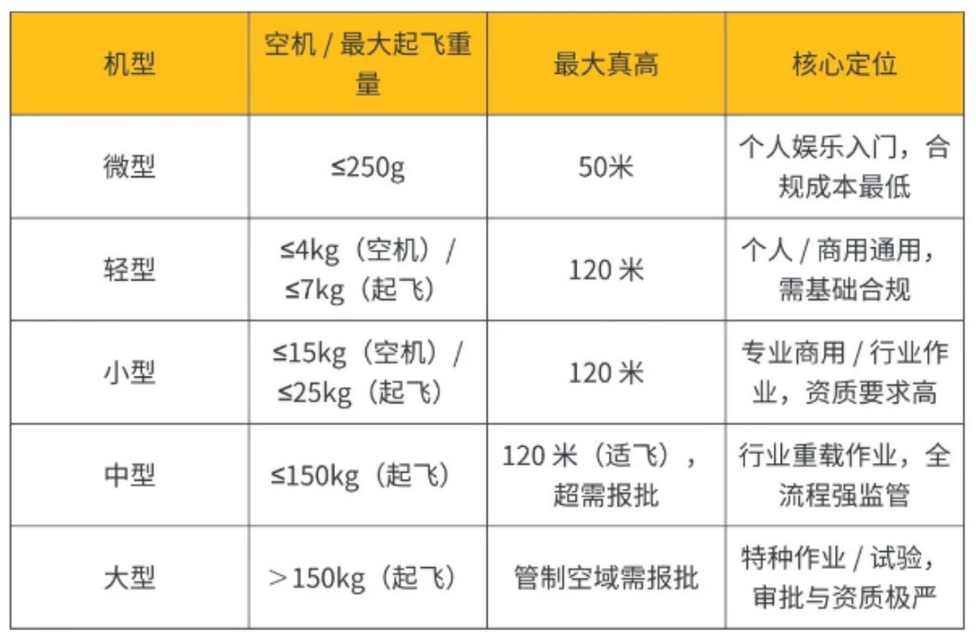 新规根据无人机的空机重量和最大起飞重量,将其分为微型、轻型、小型、中型、大型五类,合规要求逐级提高。