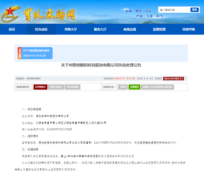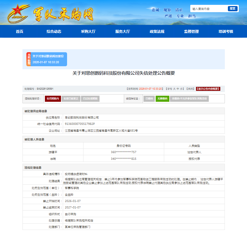 对此,处理部门根据军队供应商管理相关规定,禁止其1年内参加军事科学院范围物资工程服务采购活动的处罚。以上处理自2026年1月7日起算。在禁止期内,其法定代表人游建平控股或管理的其他企业禁止参加上述范围军队采购活动,授权代表徐瑞禁止代理其他供应商参加上述范围军队采购活动。