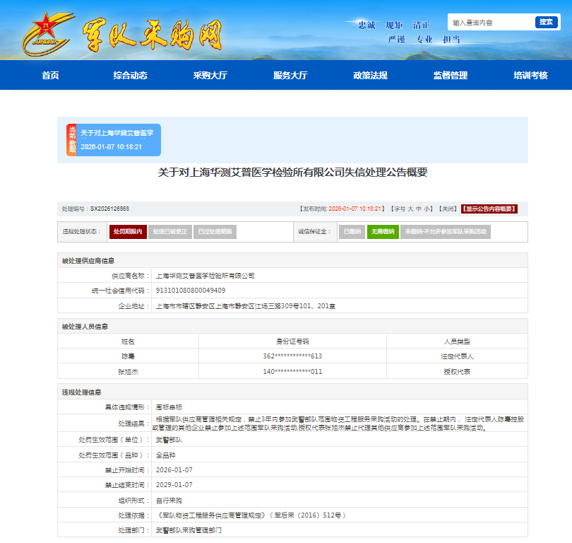 齐鲁晚报·齐鲁壹点记者于军队采购网了解到,2025年1月7日,华测检测(300012.SZ)旗下的上海华测艾普医学检验所有限公司(下称“华测艾普”)上榜军队采购失信名单。处罚生效范围(单位):武警部队;处罚生效范围(品种):全品种。处理编号:SX2026126868。