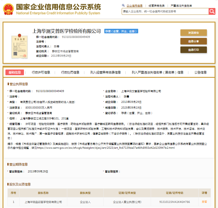 国家企业信用信息公示系统显示,上海华测艾普医学检验所有限公司成立于2013年,法定代表人陈骞,注册资本8000万元人民币,大股东为华测检测(300012.SZ)旗下的上海华测品创医学检测有限公司。
