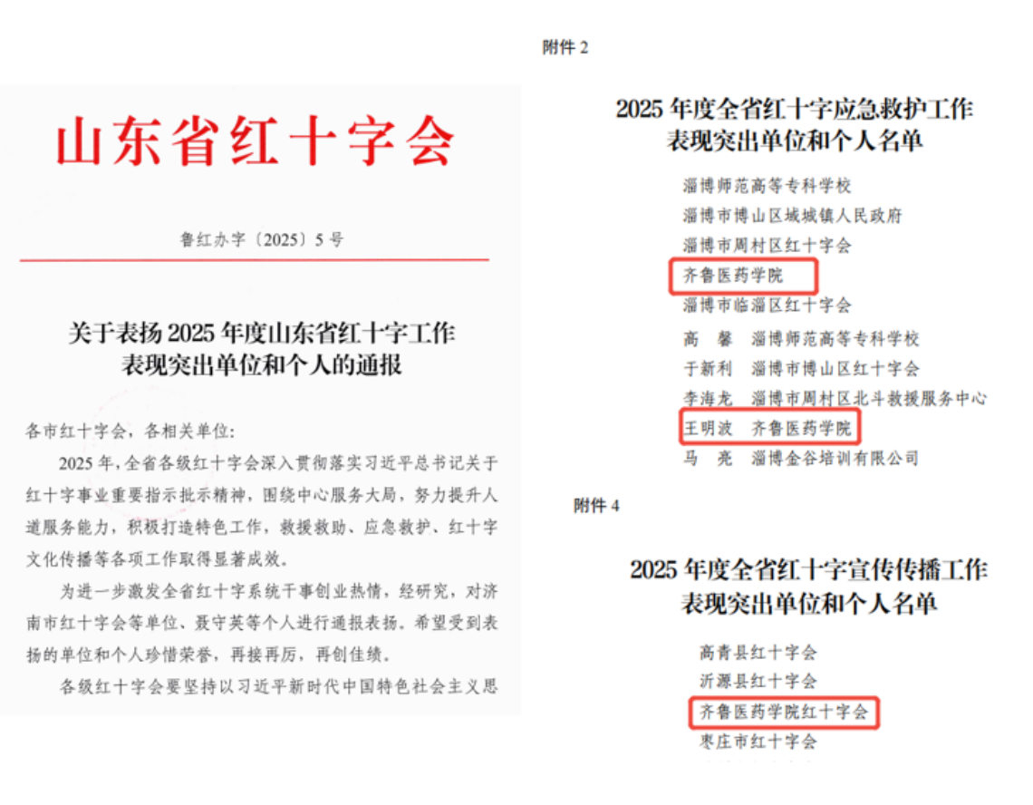 近日,山东省红十字会发布《关于表扬2025年度山东省红十字工作表现突出单位和个人的通报》,对在全省红十字事业中作出显著贡献的单位和个人予以通报表扬。其中,齐鲁医药学院荣获“2025年度全省红十字应急救护工作表现突出单位”称号,学校红十字会荣获“2025年度全省红十字宣传传播工作表现突出单位”,学校王明波老师荣获“2025年度全省红十字应急救护工作表现突出个人”称号。