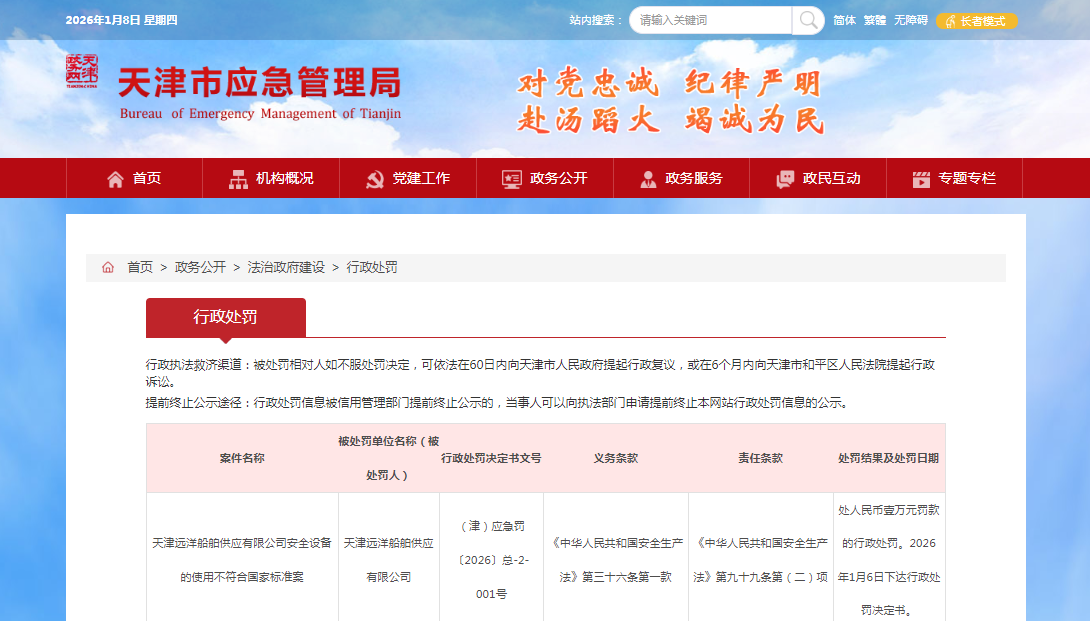 齐鲁晚报·齐鲁壹点记者于天津市应急管理局行政处罚栏获悉,1月6日,天津远洋船舶供应有限公司(下称“天津远洋船舶供应公司”)收到罚单,处罚决定书文号:(津)应急罚〔2026〕总-2-001号。
