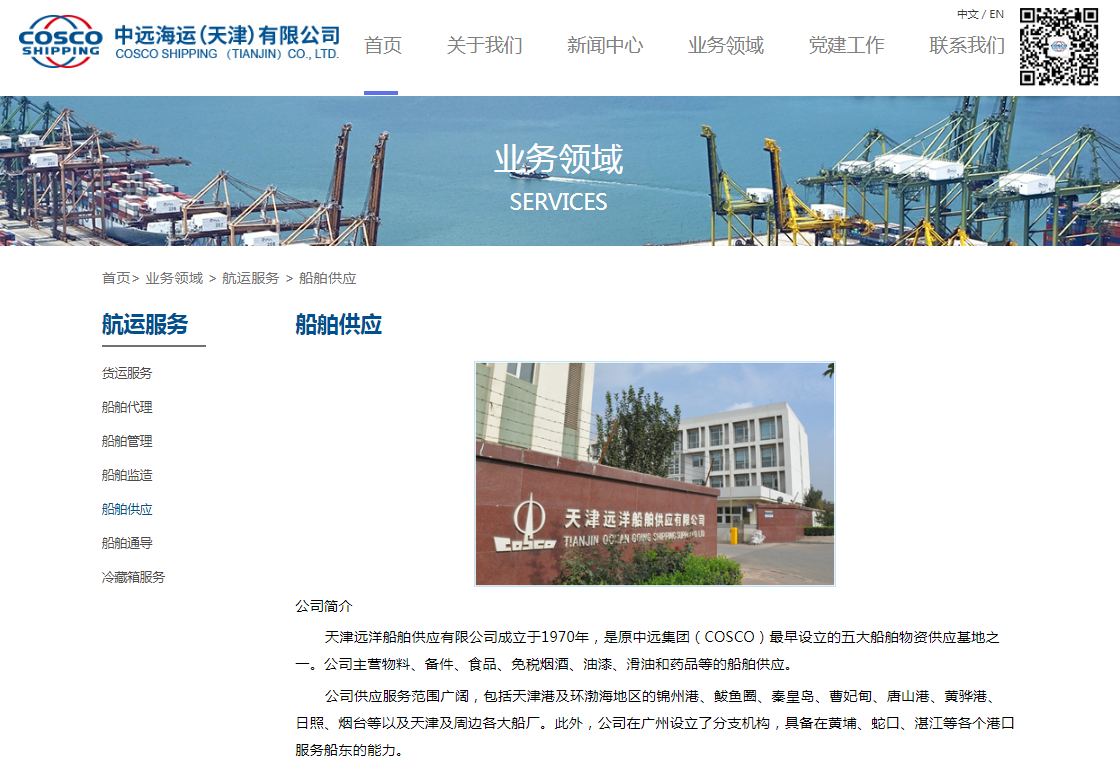 据其母公司——中远海运(天津)有限公司官网介绍,天津远洋船舶供应公司是原中远集团(COSCO)最早设立的五大船舶物资供应基地之一,主营物料、备件、食品、免税烟酒、油漆、滑油和药品等的船舶供应。公司供应服务范围广阔,包括天津港及环渤海地区的锦州港、鲅鱼圈、秦皇岛、曹妃甸、唐山港、黄骅港、日照、烟台等以及天津及周边各大船厂。