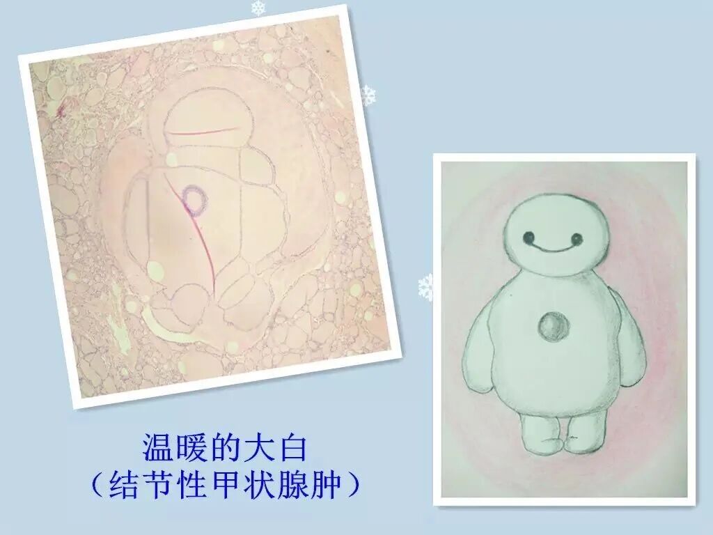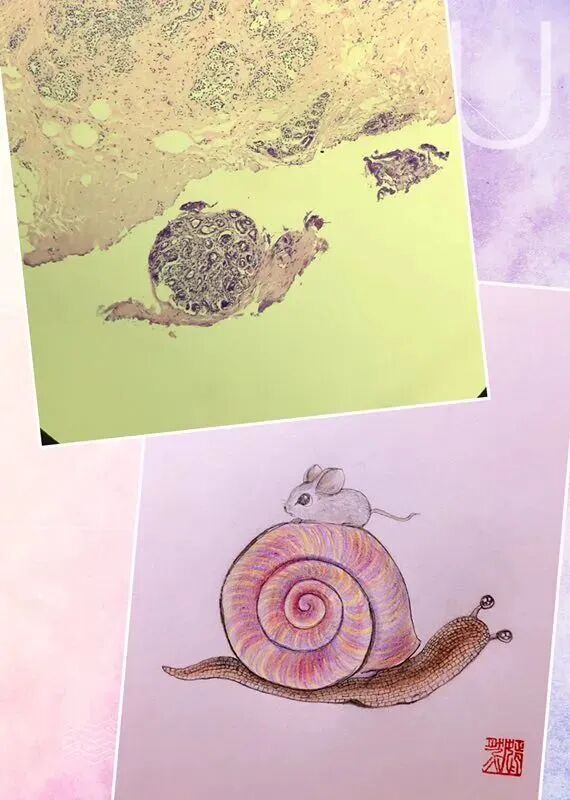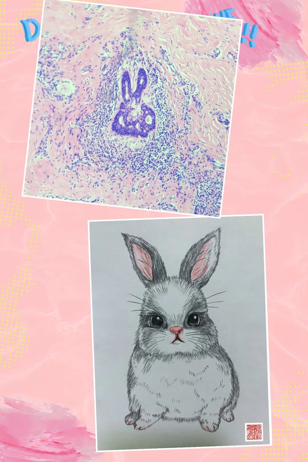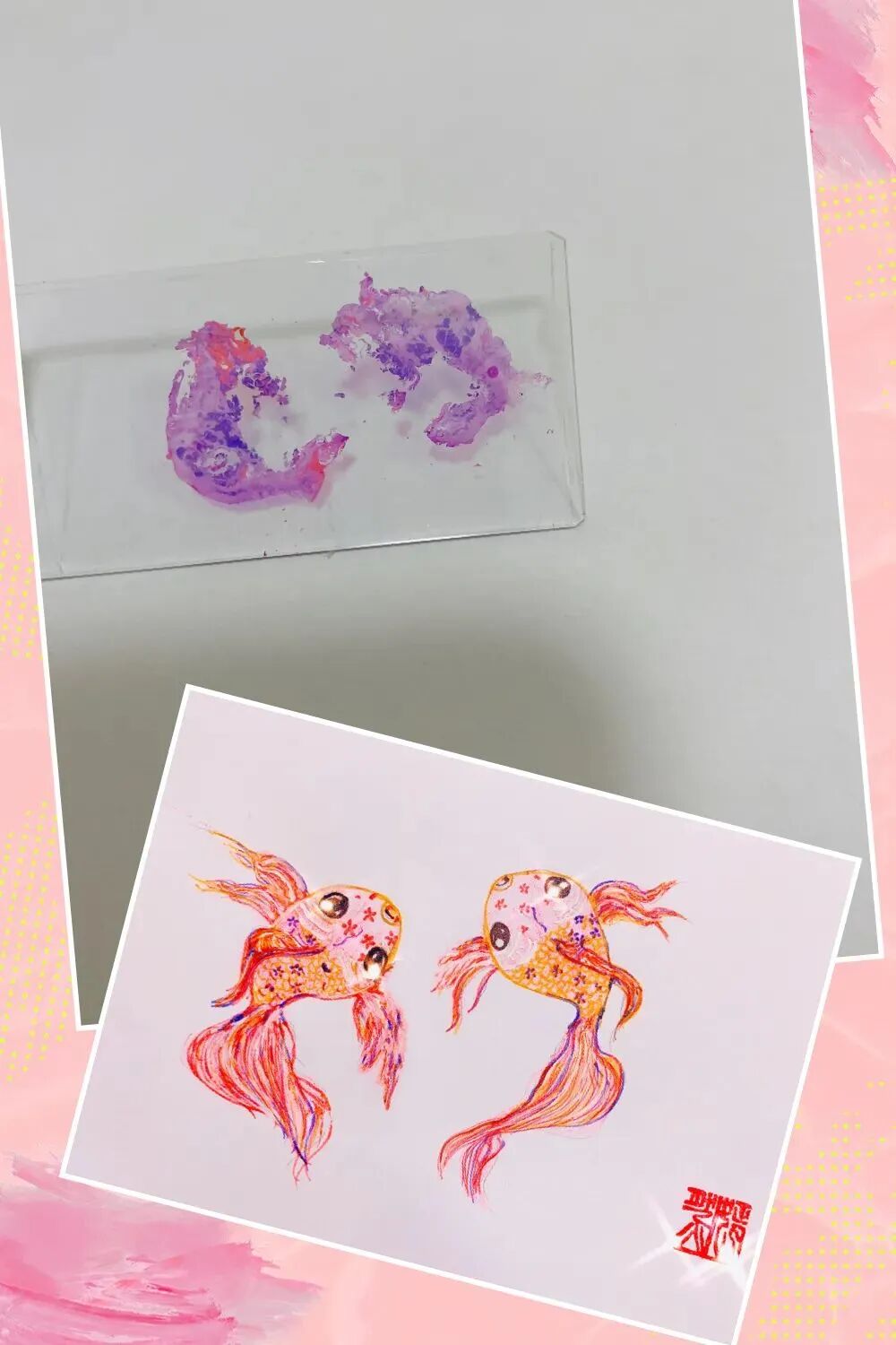 憨态可掬的蜗牛、凝神对视的小灰兔、惹人喜爱的锦鲤…… 这些美丽的图片源自于一位热爱病理工作也喜爱绘画的医生,她用一双慧眼和一双巧手,把一张张显微镜下的病理图像,变成了一幅幅精美绝伦的图画,令人拍手称赞。