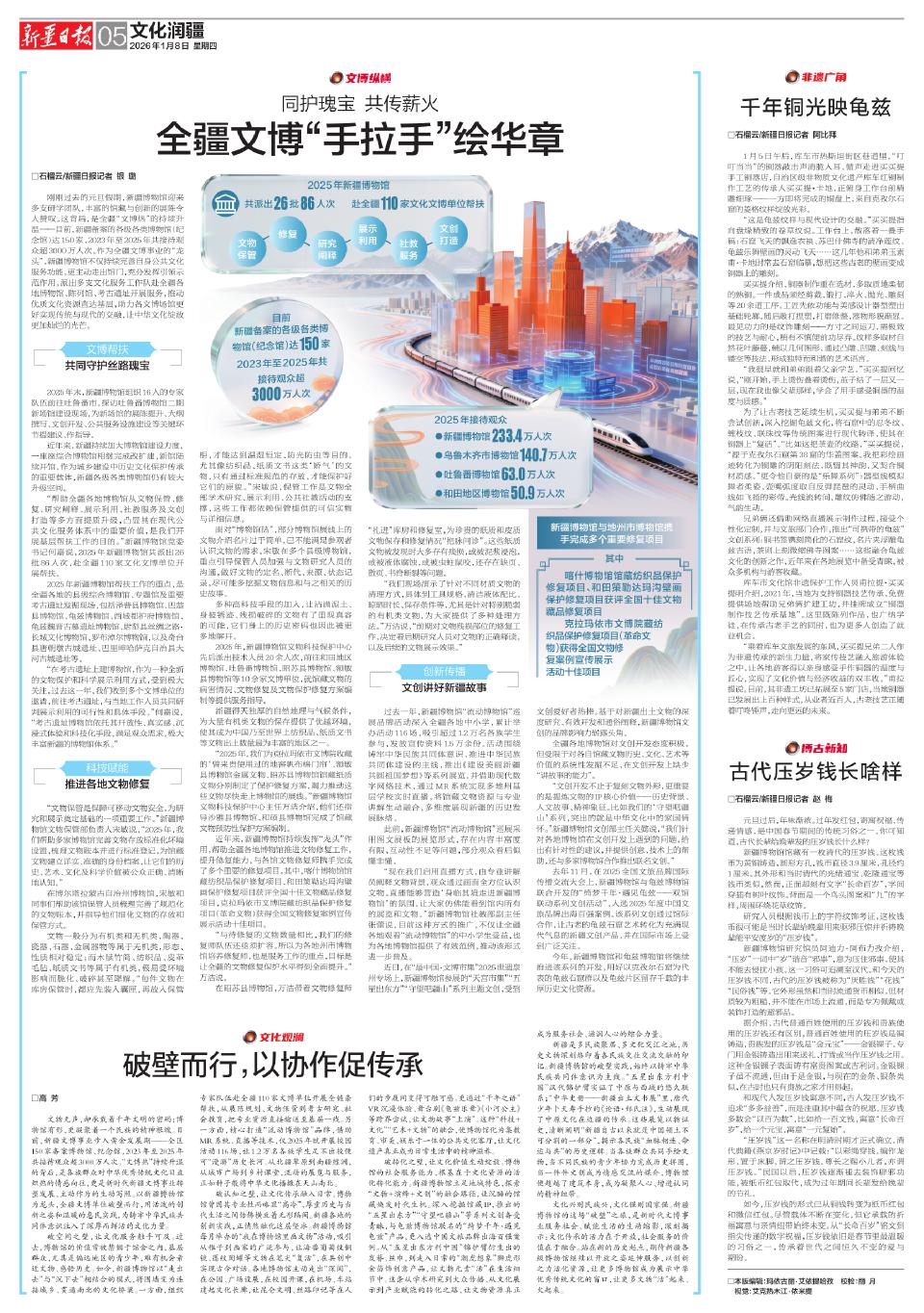 刚刚过去的元旦假期,新疆博物馆迎来多支研学团队,丰富的馆藏与创新的展陈令人赞叹。这背后,是全疆“文博热”的持续升温——目前,新疆备案的各级各类博物馆(纪念馆)达150家,2023年至2025年共接待观众超3000万人次。作为全疆文博事业的“龙头”,新疆博物馆不仅持续完善自身公共文化服务功能,更主动走出馆门,充分发挥引领示范作用,派出多支文化服务工作队赴全疆各地博物馆、陈列馆、考古遗址开展服务,推动优质文化资源直达基层,助力各文博场馆更好实现传统与现代的交融,让中华文化绽放更加灿烂的光芒。