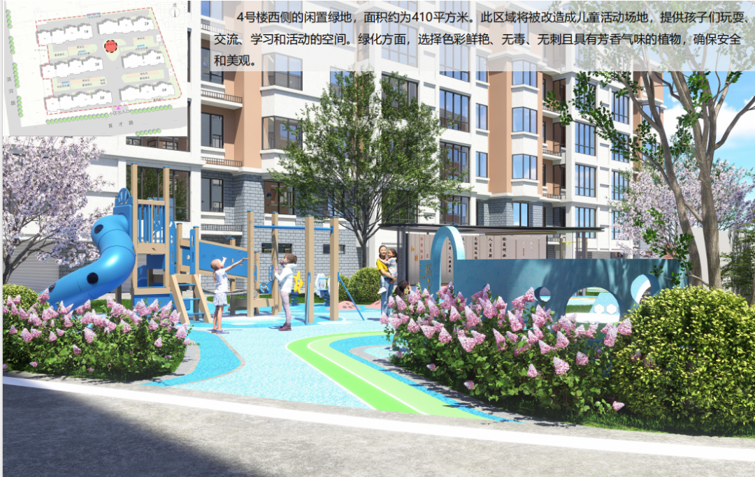 望山豪庭小区改造共涉及6栋楼、190户居民,建筑面积2.1万平方米。改造设计工作始终坚持“以人为本、因地制宜、绿色宜居”的核心原则,在广泛征询居民意见的基础上,聘请高水平设计团队,精心制作、反复打磨形成改造设计方案。改造突出三大亮点:一是活化闲置空间,巧妙利用边角地、闲置地,打造包含健身器材、儿童游乐场的复合型公共空间,满足全龄段居民活动需求;二是融入低碳理念,在车棚顶部安装太阳能光伏板,实现空间集约利用与环保节能有机结合;三是聚焦适老宜居,在完善屋面防水及外墙保温的基础上,对单元入户门进行无障碍改造,切实提升老年人居住便利性。