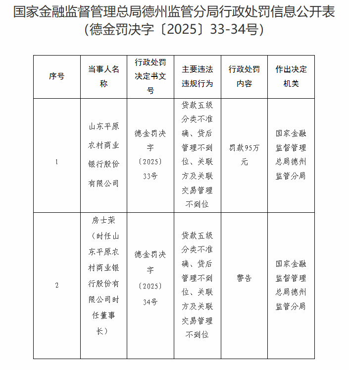 1月7日,据国家金融监督管理总局德州监管分局行政处罚信息公开表显示,山东平原农村商业银行股份有限公司因贷款五级分类不准确、贷后管理不到位、关联方及关联交易管理不到位被罚款95万元。同时,房士荣(时任山东平原农村商业银行时任董事长)因贷款五级分类不准确、贷后管理不到位、关联方及关联交易管理不到位,被警告。 (来源:山东监管局)
