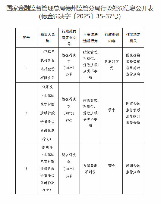 1月7日,据国家金融监督管理总局德州监管分局行政处罚信息公开表显示,山东临邑农村商业银行股份有限公司因 授信管理不到位、贷款五级分类不准确被罚款75万元。同时,张学良(山东临邑农村商业银行股份有限公司时任副行长)因授信管理不到位、贷款五级分类不准确,被警告;高宪锋(山东临邑农村商业银行股份有限公司时任副行长)因授信管理不到位,被警告。