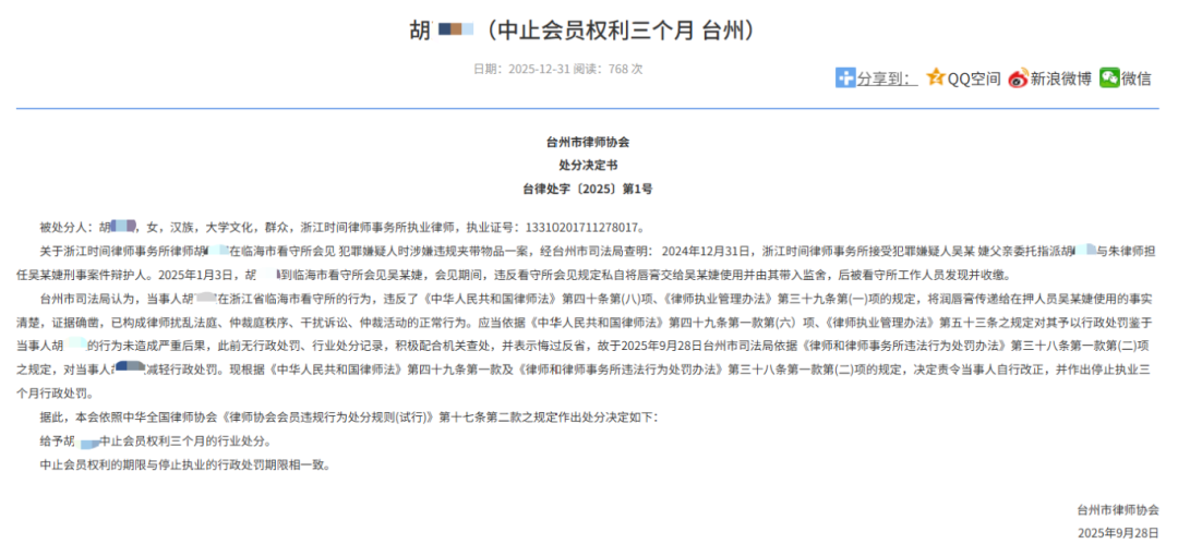处分决定书载明,台州市司法局查明:2024年12月31日,浙江某律师事务所接受犯罪嫌疑人吴某某父亲委托指派胡律师与朱律师担任吴某某刑事案件辩护人。