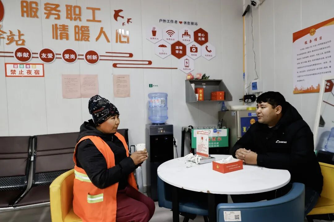 喀什市东湖工会驿站内配备了免费饮用热水、休息座椅、充电设备等便民物资,环卫工人、外卖骑手、志愿者等均可扫码进入休憩取暖、补充能量。