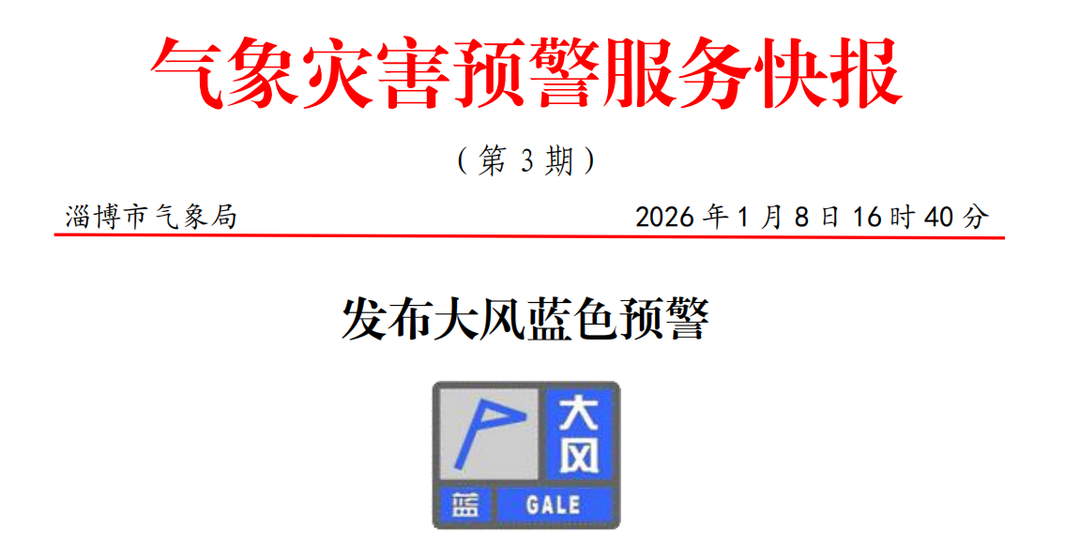 1月8日16时40分,淄博市气象台发布大风蓝色预警:受冷空气影响,预计9日夜间—11日,淄博市将出现平均风力4~6级阵风7~8级的偏北大风。另外,大风影响期间,部分时段有扬沙或浮尘。