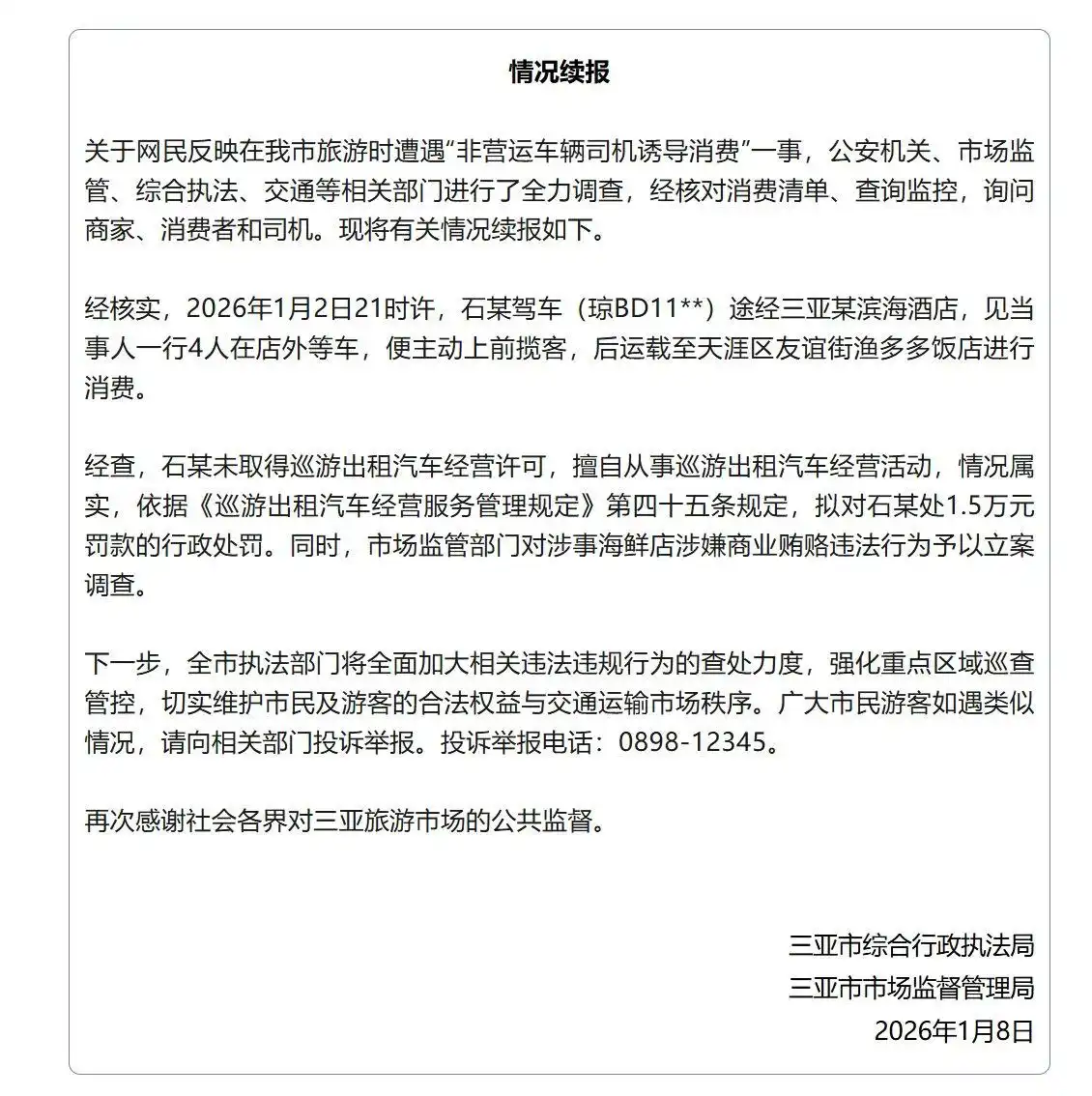 1月8日,三亚市综合行政执法局、三亚市市场监督管理局发布情况续报: