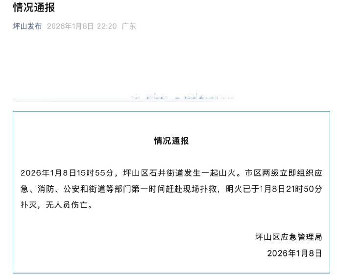 据坪山发布消息,2026年1月8日15时55分,坪山区石井街道发生一起山火。市区两级立即组织应急、消防、公安和街道等部门第一时间赶赴现场扑救,明火已于1月8日21时50分扑灭,无人员伤亡。
