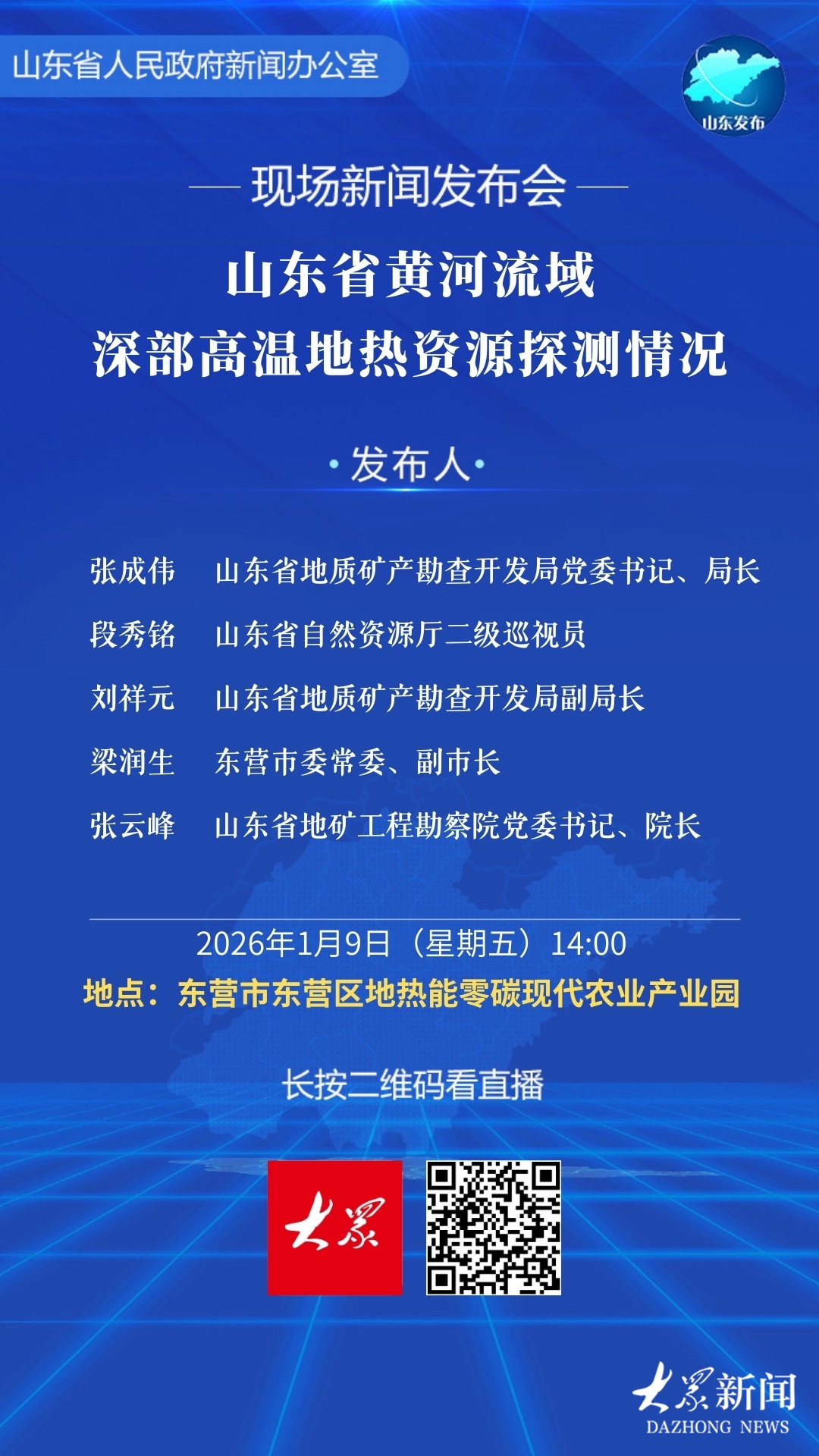 事关黄河流域深部高温地热资源探测!今天下午2时山东省政府将举行新闻发布会山东发布 | 2026-01-09 11:15:32 原创崔晗 申家鑫来源:大众新闻微信扫码扫码下载客户端省政府新闻办定于1月9日(周五)14:00在东营市牛庄镇双福花卉产业园举行现场新闻发布会,邀请省地矿局负责同志等介绍山东省黄河流域深部高温地热资源探测情况。(大众新闻记者 崔晗 申佳鑫)责任编辑:韩雨婷