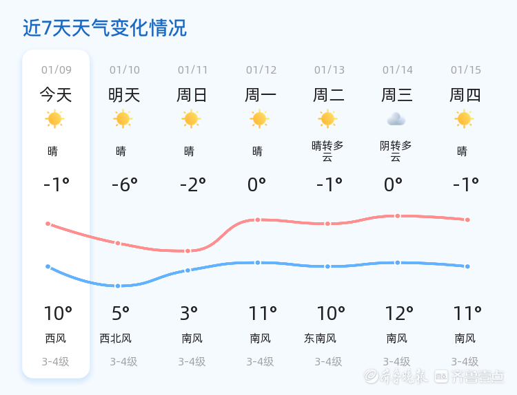 今天是2026年1月9日,星期五,农历十一月廿一。聊城地区今日天气晴朗,气温在-1℃到10℃之间。目前实时温度为-0.4℃,南风2级,空气湿度61%,PM2.5指数为74,空气质量良好。各区县天气情况基本一致,均为晴朗天气,适宜户外活动。 明日聊城天气仍以晴朗为主,但气温将有所下降。预计明日最低气温为-6℃,最高气温为5℃,较今日降幅较大,风力维持在3-4级。市民需注意防寒保暖,特别是早晚温差较大,建议增添衣物。 未来三天,聊城天气持续晴朗,气温将呈现回升趋势。预计11日气温在-2℃到3℃之间,12日气温回升至0℃到11℃,13日天气晴转多云,气温在-1℃到10℃之间。风力保持在3-4级,以南风为主。建议市民根据天气变化合理安排出行,特别是12日气温回升明显,适合户外活动。 温馨提示
