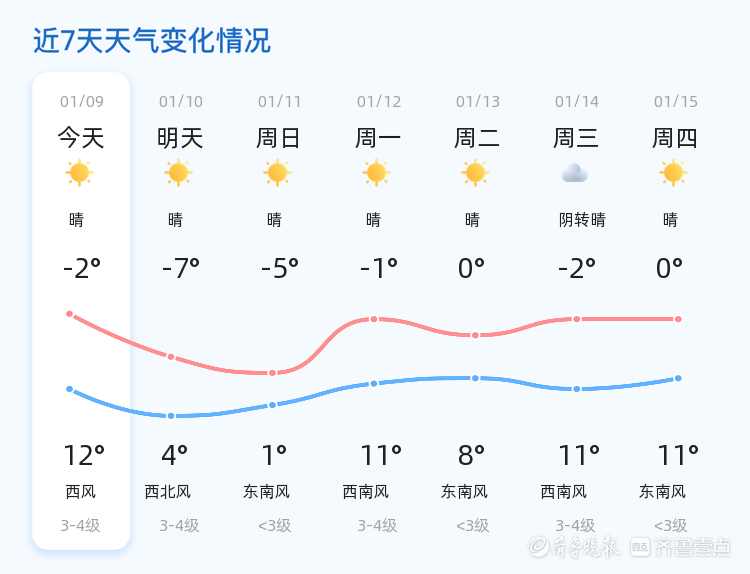 未来三天,淄博市天气以晴为主,但气温波动较大。11日,气温在-5℃至1℃之间,风力较小;12日,气温回升至-1℃至11℃,西南风3-4级;13日,气温在0℃至8℃之间,东南风风力较小。提醒市民根据天气变化及时调整衣物,尤其是老人和儿童,需防范感冒等疾病的发生。