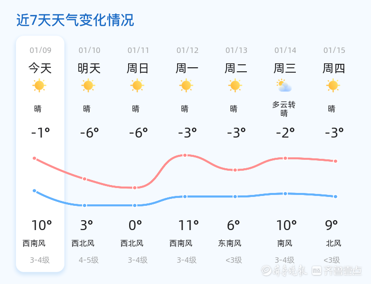未来三天(1月11日至1月13日),潍坊市天气仍以晴朗为主,但气温波动较大。1月11日,最低气温为-6℃,最高气温为0℃;1月12日,最低气温回升至-3℃,最高气温可达11℃;1月13日,气温略有下降,最低气温-3℃,最高气温6℃。提醒市民注意天气变化,及时增减衣物。