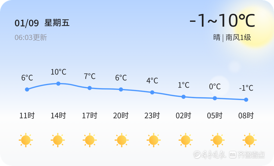 今日是2026年1月9日,星期五,农历十一月廿一。潍坊市今日天气晴好,白天气温较为适宜,最高气温可达10℃,最低气温为-1℃。全市各区天气状况一致,均为晴朗天气,风力较小,南风1级,空气湿度为49%,PM2.5指数为67,空气质量良好。
