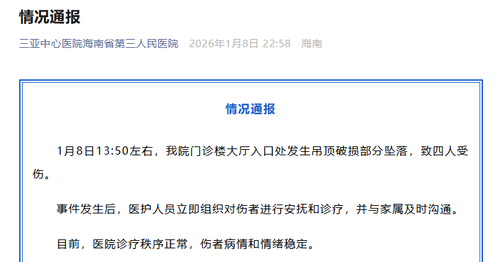 1月8日晚,三亚中心医院(海南省第三人民医院)发布情况通报称,该院门诊楼大厅入口处发生吊顶破损部分坠落,致4人受伤。目前伤者病情和情绪稳定。