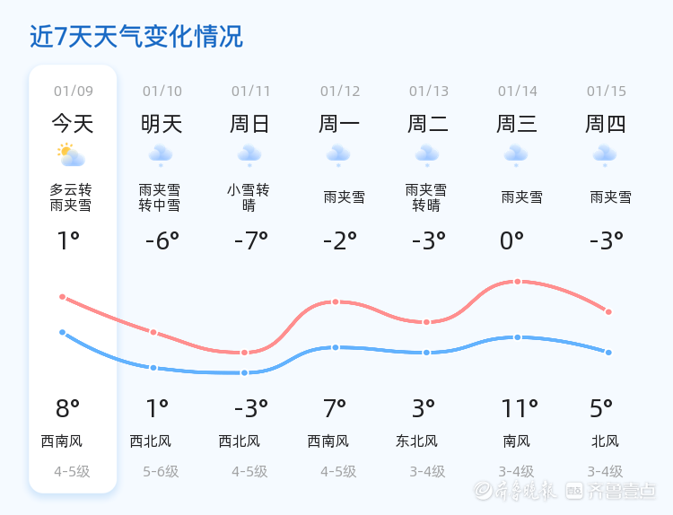 今天是1月9日,星期五,农历十一月廿一。烟台市迎来多云转雨夹雪的天气,气温在1到8摄氏度之间,西南风4级。各区天气情况基本一致,市民出行需注意防寒保暖。