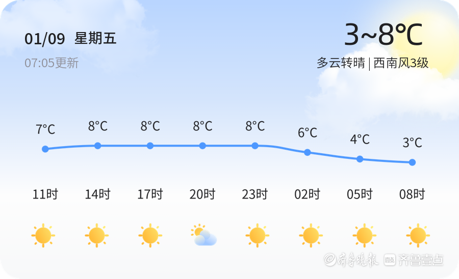 今天是2026年1月9日,农历十一月廿一,星期五。青岛市今天天气以多云转晴为主,气温适中,最高气温8℃,最低气温3℃。目前空气质量良好,PM2.5浓度为65,属于良好水平。风力方面,今日以西南风3级为主,风速适中。市民外出时建议随身携带雨具,以备不时之需。