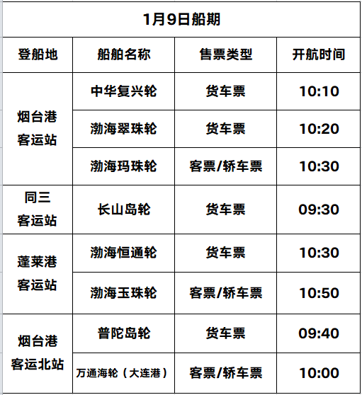 从山东港口烟台港获悉,受气象影响,预计1月9日15:00后烟台一大连航班停航,16:00后蓬莱一旅顺航班停航,1月9日暂定航班变更如下,请旅客朋友合理安排出行时间。实际班期会根据气象情况进行调整,具体开航时间以海事放行时间为准,咨询电话0535-6506666。(通讯员严纲轩)