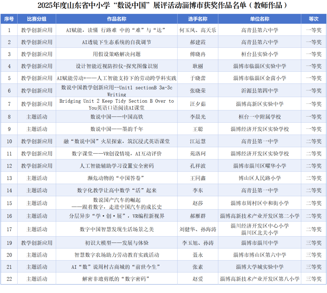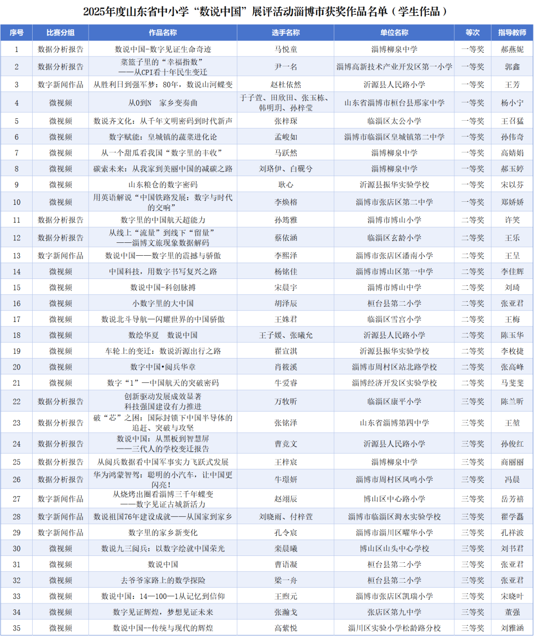 近日,山东省电化教育馆公布了2025年度山东省中小学“数说中国”展评活动获奖作品名单,淄博市师生在本届展评活动中表现优异,共有57件作品获奖,其中一等奖19个、二等奖19个、三等奖19个。获奖作品不仅展示了淄博市师生用数字技术讲好中国故事、传播淄博声音的生动实践,更是对淄博市长期坚持深化教学改革、提升师生数字素养工作的集中检验与积极肯定。