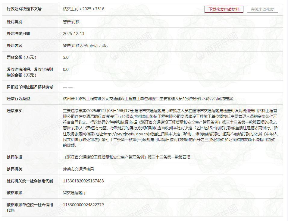 日前,信用中国公示了杭州萧山路桥工程有限公司的行政处罚决定。行政处罚决定书文号杭交工罚﹝2025﹞7316显示,2025年12月03日15时17分,建德市交通运输局行政执法人员在建德市交通运输局检查时发现杭州萧山路桥工程有限公司存在交通运输行政违法行为,经调查,杭州萧山路桥工程有限公司交通建设工程施工单位调整后主要管理人员的资格条件不符合合同约定。依据《浙江省交通建设工程质量和安全生产管理条例》第三十三条第一款第四项的规定,警告,罚款人民币伍万元整。