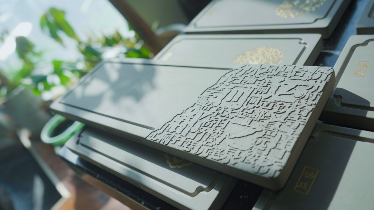“这几件是为江西龙虎山风景名胜区的旅游民宿定制的产品,后续我还打算融入更多龙虎山文化元素,打造更具地域特色的文创作品。”薛琦介绍,儒苑青陶承袭千年古法,以“朴实无华、静谧深邃、万年不朽”的鲜明特质世代流传。随着烧制技艺日趋成熟,他创作的壶承、茶台品类不断丰富,纹饰与文字中皆蕴含着厚重的传统文化底蕴。