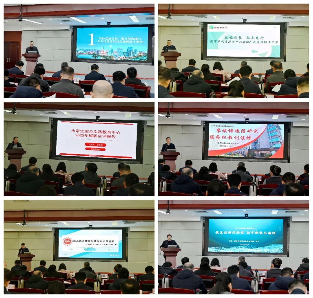 市教育招生考试院、市教育服务中心、市学生综合实践教育中心、市职业教育研究院、市基础教育研究院、市教育信息化研究院6家事业单位主要负责人围绕新时代党的建设、运行管理、履行职责等方面,通过PPT依次展示了今年的工作成果、存在问题及下一步打算,客观实在讲成绩、查问题、亮举措、谋发展,营造了提效争先、比学赶超的浓厚氛围,展现出教育系统凝心聚力、攻坚克难,落实立德树人根本任务、推动教育高质量发展的扎实干劲。市教育局专业考核委员会成员进行了现场评议。