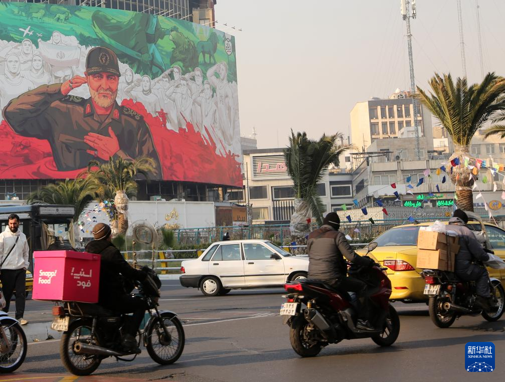 6日,在伊朗首都德黑兰街头,车辆经过一幅绘有伊遇袭身亡的高级将领苏莱曼尼形象的宣传海报。