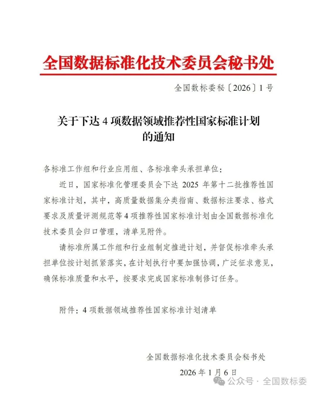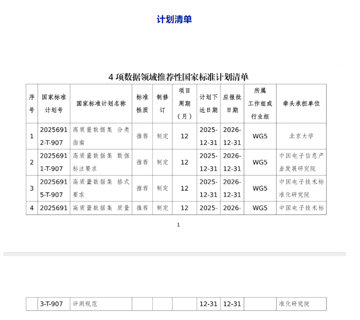 近日,国家标准化管理委员会下达2025年第十二批推荐性国家标准计划,其中,高质量数据集分类指南、数据标注要求、格式要求及质量评测规范等4项推荐性国家标准计划由全国数据标准化技术委员会归口管理,清单见附件。