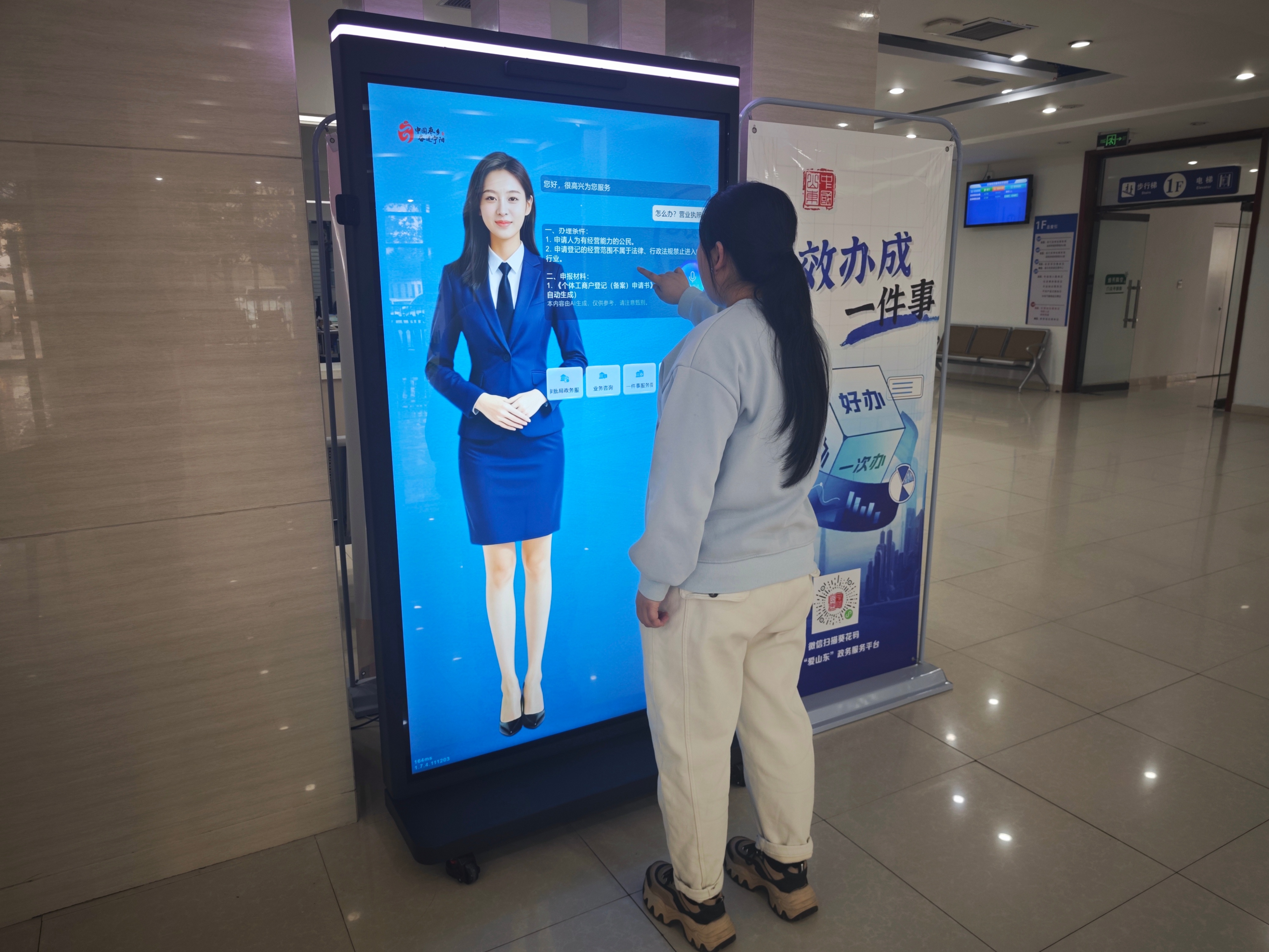 为满足不同群体、不同场景的办事咨询需求,宁阳县构建起“线上线下一体、多端无缝协同”的立体化服务矩阵。线下政务服务中心,大屏数字人“宁小易”化身“智能导引员”,企业和群众步入大厅即可便捷交互;线上,“宁小易”同步部署于微信公众号与政务服务网,实现电脑端、移动端、自助设备端全面覆盖,让“办事必须到大厅”成为过去,“服务随时在指尖”成为现实。