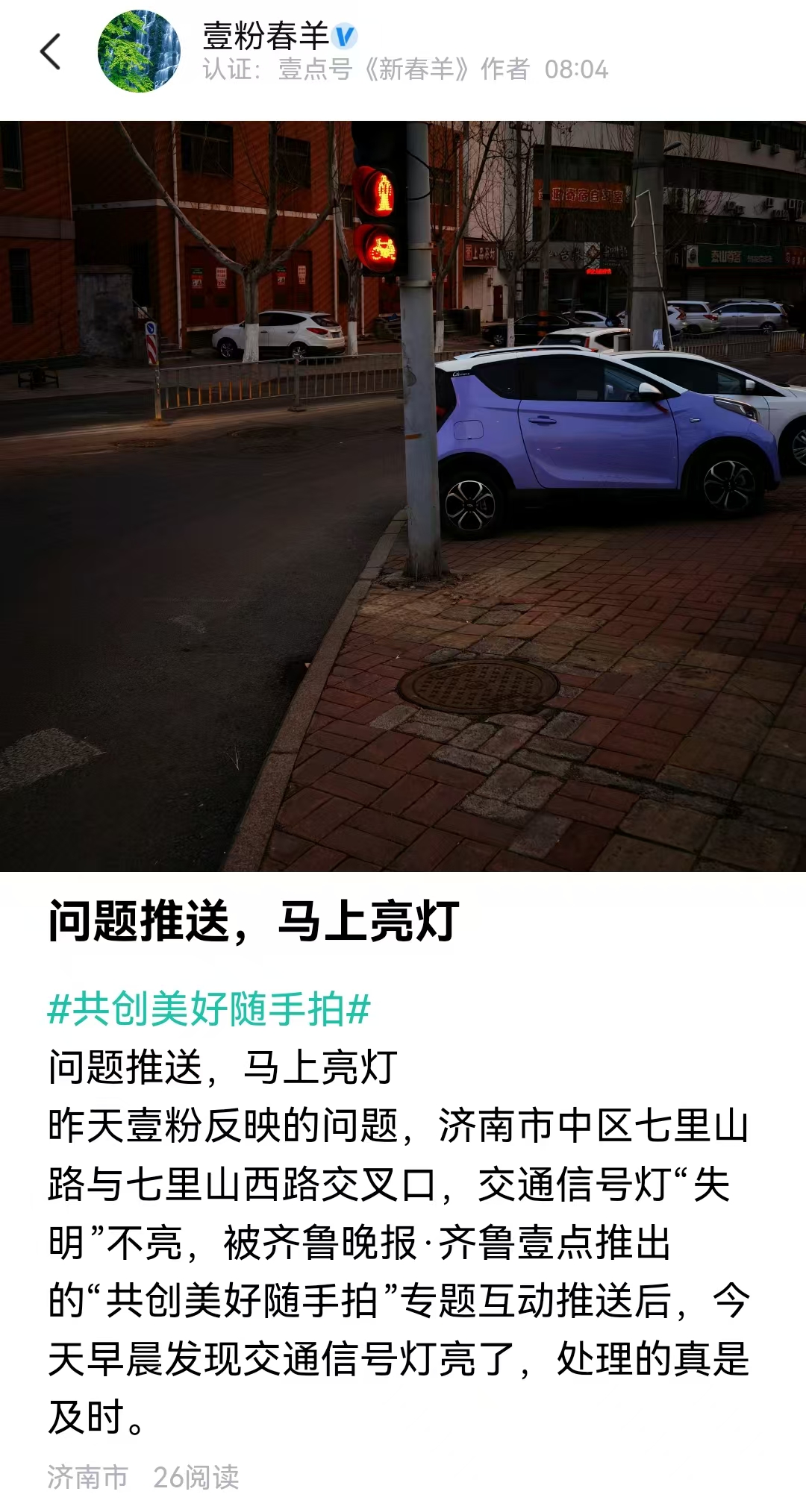 1月9日,情报员“春羊”向齐鲁晚报官方客户端齐鲁壹点情报站发来一则反馈情报,“昨天反映的问题,济南市中区七里山路与七里山西路交叉口,交通信号灯‘失明’不亮,被齐鲁晚报·齐鲁壹点推出的'共创美好随手拍'专题互动推送后,今天早晨发现交通信号灯亮了。”