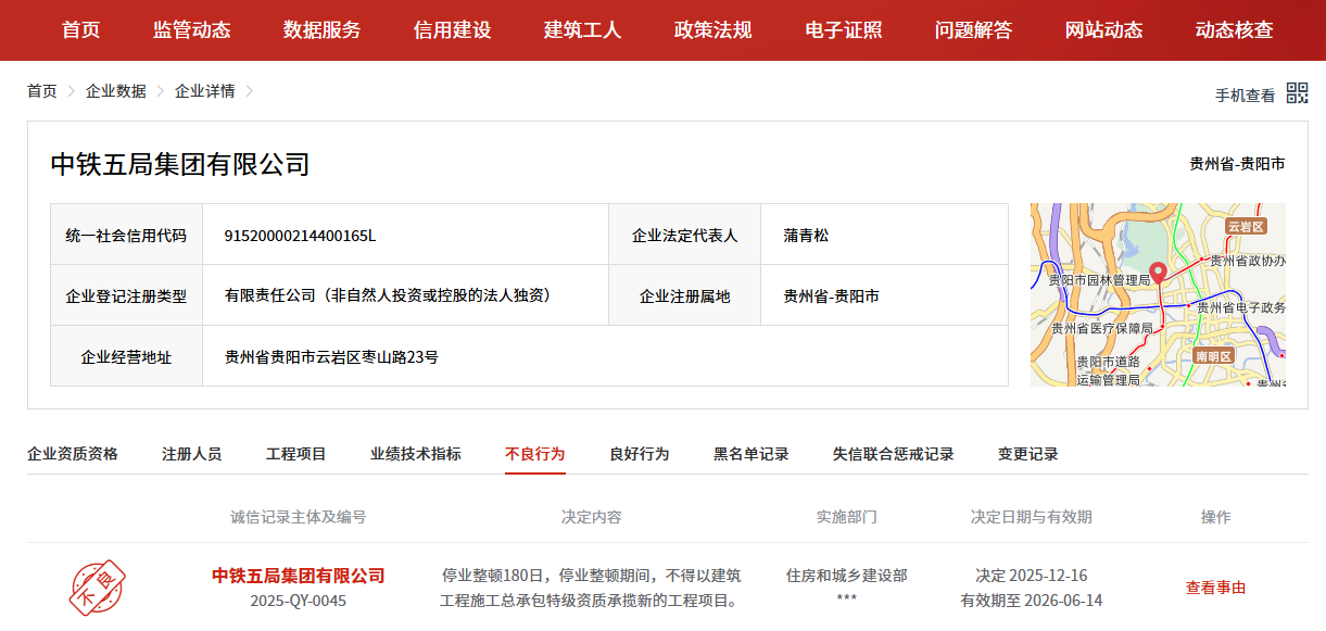 齐鲁晚报·齐鲁壹点记者从全国建筑市场监管公共服务平台获悉,中铁五局集团有限公司(以下简称“中铁五局”)被住房和城乡建设部实施停业整顿180日,决定时间为2025年12月16日,有效期至2026年6月14日。停业整顿期间,不得以建筑工程施工总承包特级资质承揽新的工程项目。