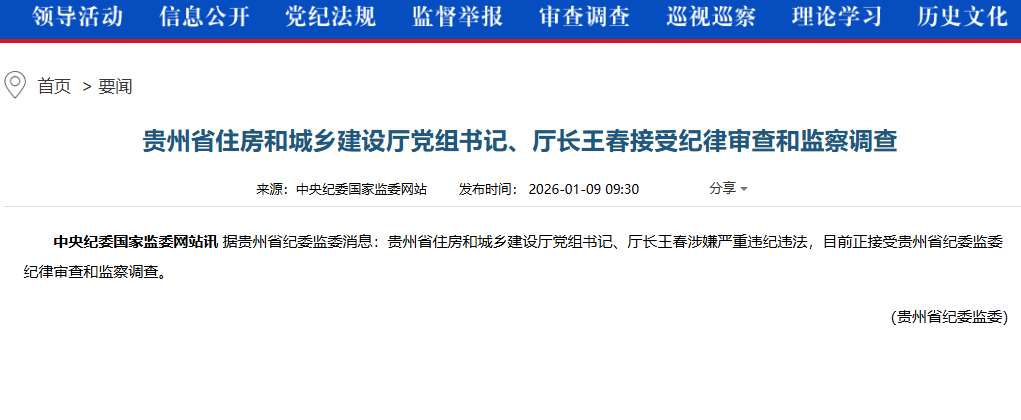 1月9日,据贵州省纪委监委消息:贵州省住房和城乡建设厅党组书记、厅长王春涉嫌严重违纪违法,目前正接受贵州省纪委监委纪律审查和监察调查。