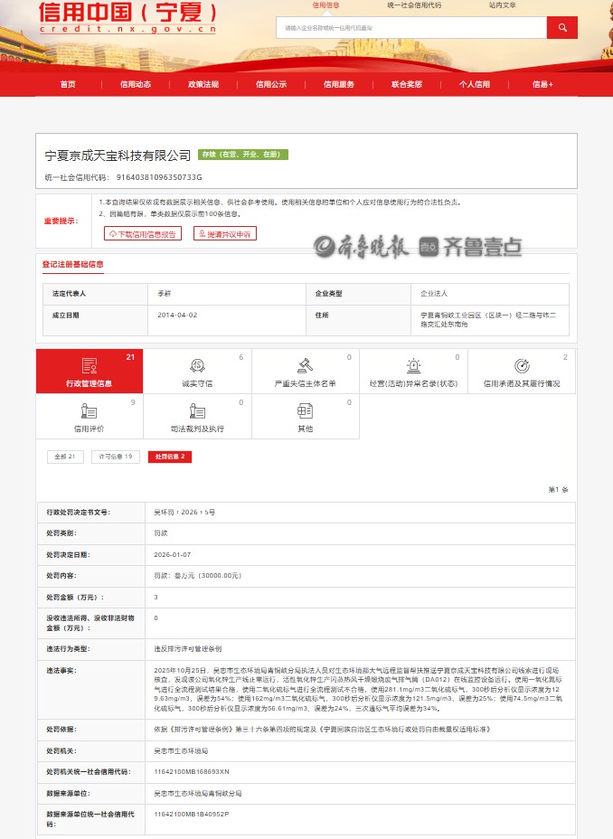 近日,齐鲁晚报·齐鲁壹点记者从信用中国(宁夏)获悉,宁夏京成天宝科技有限公司因违反排污许可管理条例,被吴忠市生态环境局罚款30000元。