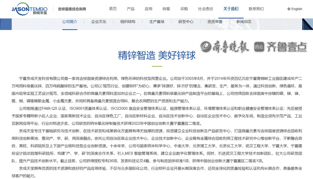 宁夏京成天宝科技有限公司是一家将含锌固废资源综合利用、绿色环保的科技型民营企业。公司创于2003年8月,并于2014年斥资四亿元在宁夏青铜峡工业园区建成年产二万吨饲料级氧化锌、四万吨硫酸锌的生产基地。公司以“规范行业、创建标杆”为初心,秉承“锌源好,锌才好”的理念,集研发、生产、服务为一体,通过科技创新、绿色循环,是国内较早实现工艺设计规范、全领域科研合作的微量元素饲料添加剂企业之一。在微量元素饲料级氧化锌产品制造平台的基础上,公司持续回收含锌固废中伴随的铟、镓、锗、锡、铜、镉等稀散金属、小金属元素,并同时具备微量元素预混合饲料、复合农用肥的生产资质和生产能力。
