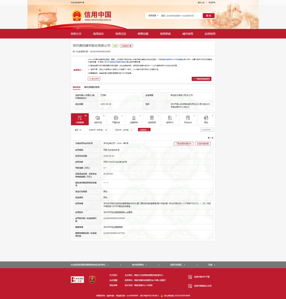 齐鲁晚报·齐鲁壹点记者于信用中国行政处罚栏获悉,深圳港创建材股份有限公司(下称“港创建材”)收到罚单,处罚类别为“罚款;没收违法所得”,处罚机关是深圳市市场监督管理局南山监管局。
