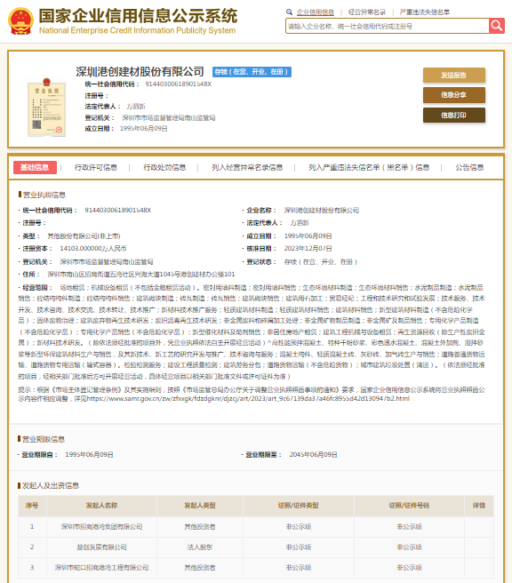 国家企业信用信息公示系统显示,深圳港创建材股份有限公司成立于1995年,注册资本14103万元人民币,法定代表人万泗新,大股东为深圳市招商港湾集团有限公司。