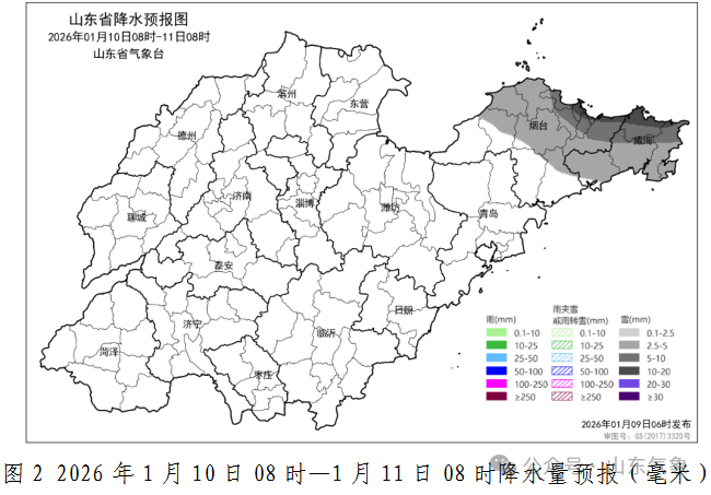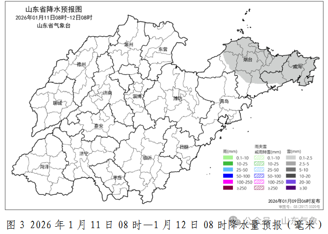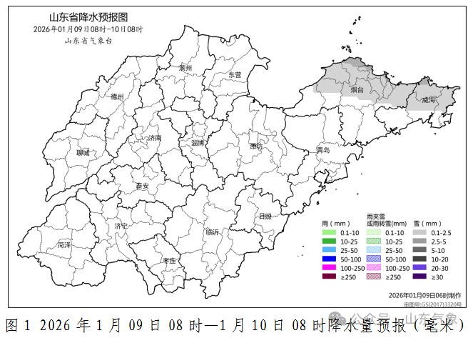 9日白天到夜间,烟台北部和威海天气多云转阴有小雪局部中雪,其他地区天气晴到少云。滨州、东营、潍坊、日照、内陆湖面和半岛地区南风4~5级阵风7~8级转北风5~7级阵风8~9级,其他地区南风转北风4~5级阵风7~8级。夜间最低气温:鲁西北、鲁中山区和半岛内陆地区-5℃左右,其他地区-2℃左右。最高气温:鲁中山区和半岛地区7℃左右,聊城、菏泽和济宁13℃左右,其他地区10℃左右。