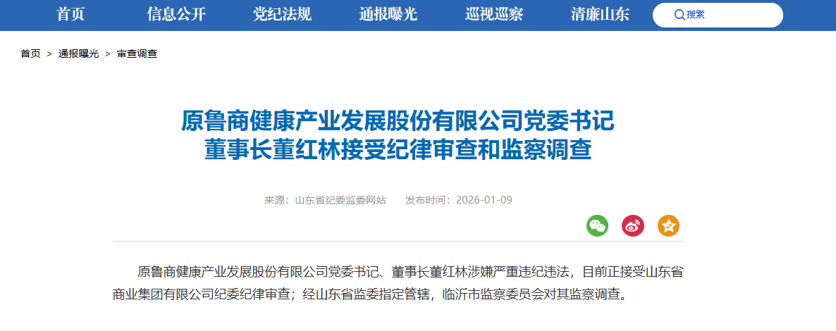 1月9日,据山东省纪委监委网站消息:原鲁商健康产业发展股份有限公司党委书记、董事长董红林涉嫌严重违纪违法,目前正接受山东省商业集团有限公司纪委纪律审查;经山东省监委指定管辖,临沂市监察委员会对其监察调查。