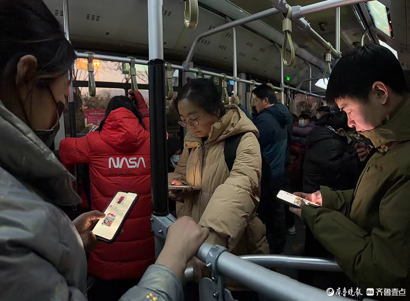 1月6日济南晚高峰,K88路公交挤得满满当当,裹着厚羽绒服的上班族纷纷点亮手机屏开启了刷屏时刻。方寸屏幕成了拥挤车厢里的个人专属空间,将一天的疲惫与车上的喧嚣,都隔绝在亮起的屏幕之外。王剑摄