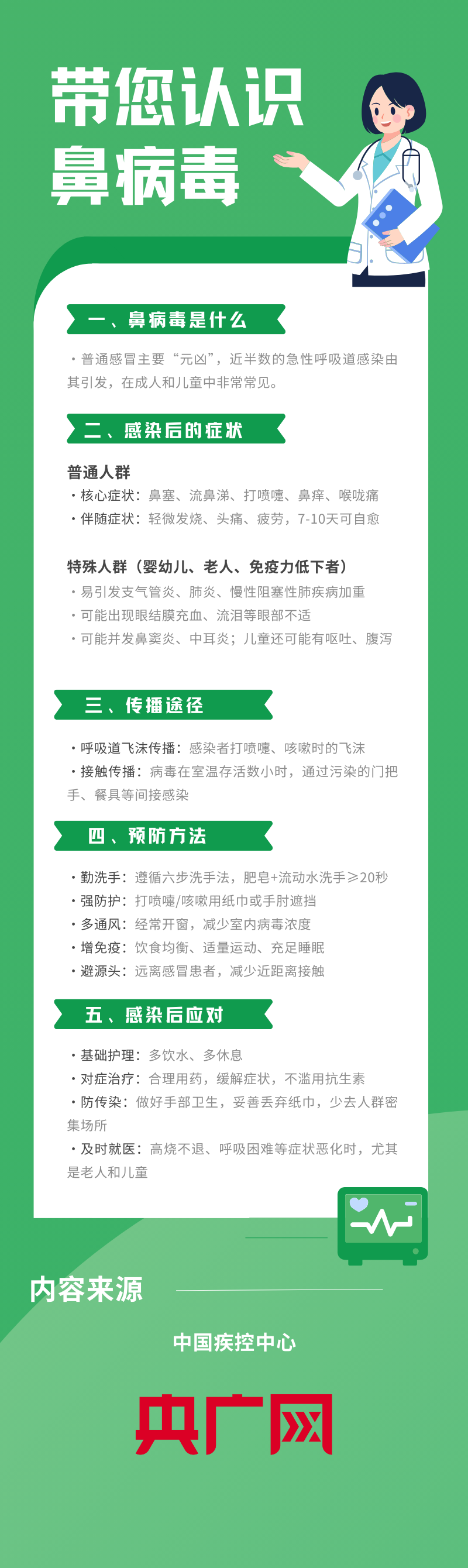 警惕风险与就医信号感染鼻病毒后,多数健康人群7至10天可自愈。特殊人群(婴幼儿、老人、免疫力低下者)感染后需警惕,可能引发下呼吸道感染,或诱发哮喘、慢阻肺急性发作。